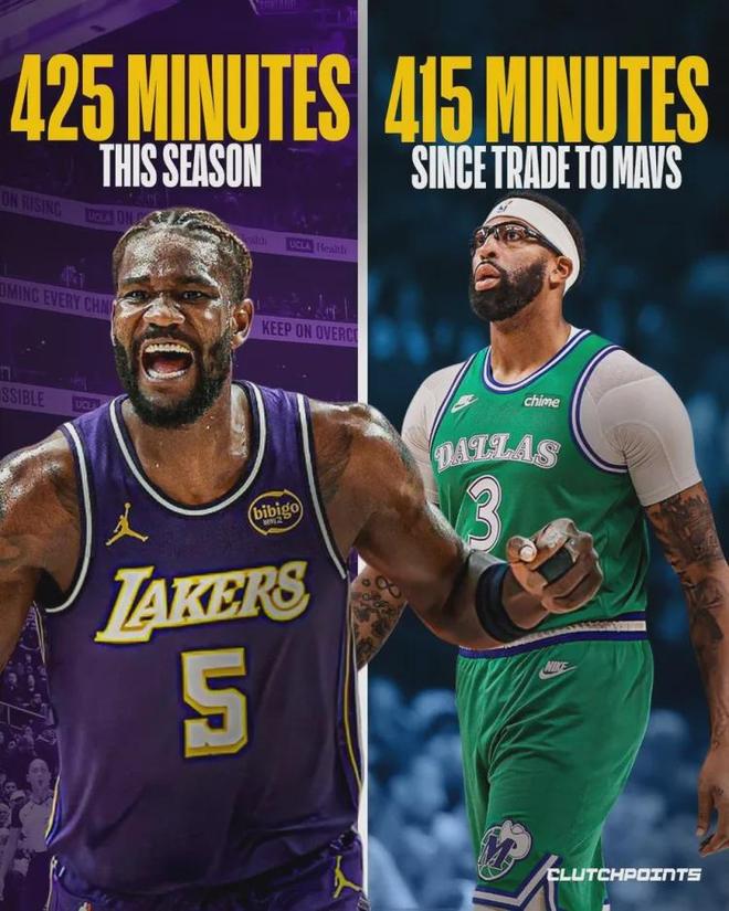 “统治者”艾顿,本赛季至今为湖人出战14场比赛,总共上阵425分钟;浓眉哥身披独行侠战袍14场比赛里,合计上阵415分钟。