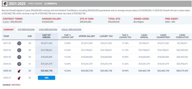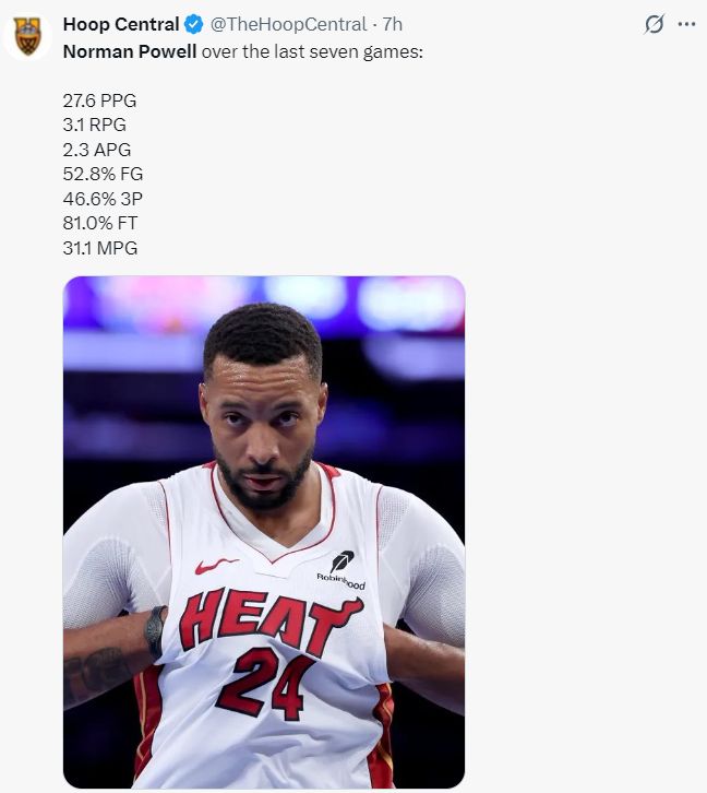 美媒写道:热火队史只有詹姆斯、韦德赛季平均达到过25分,目前鲍威尔场均超过25分,他有希望成为热火队史第三人。